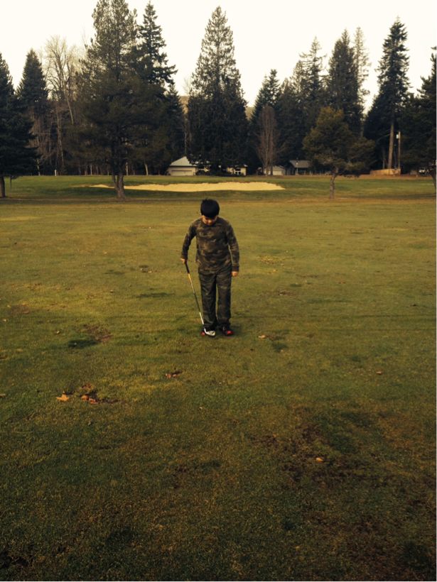 小陸、ゴルフキャンプではパターまでしかやってないからグリーンデビュー心配,,,。ま、8ホール貸しきりだからねー。父子で色々あったようですが、三時間後歩きすぎてくたくたになって帰ってきました。