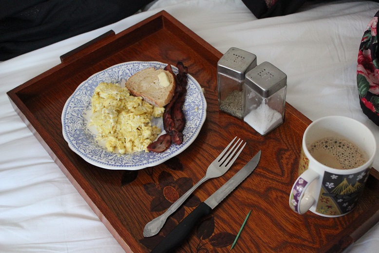 今朝は私、ベッドの上で朝食をいただきました。小陸が昨日寝る前に「お母さん、明日何食べたい?」って聞いてくれたので、「じゃあベーコン・エッグにコーヒーかな」ってお願いしてたのです。