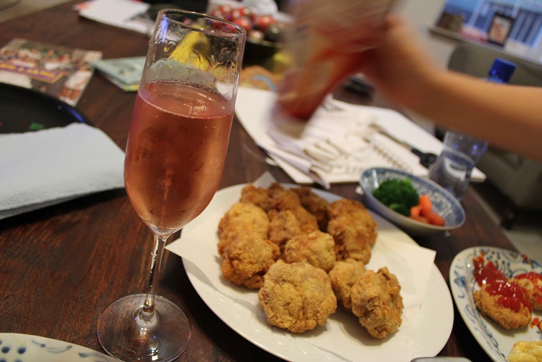 前回はお肉に対してスパイスが少なくてあんまり味がなかったby小陸・・・でしたが今回はばっちり。マックナゲット風のお味にしあがりました!そしてマダムには泡よね!老陸、いないから勝手に飲んだる!