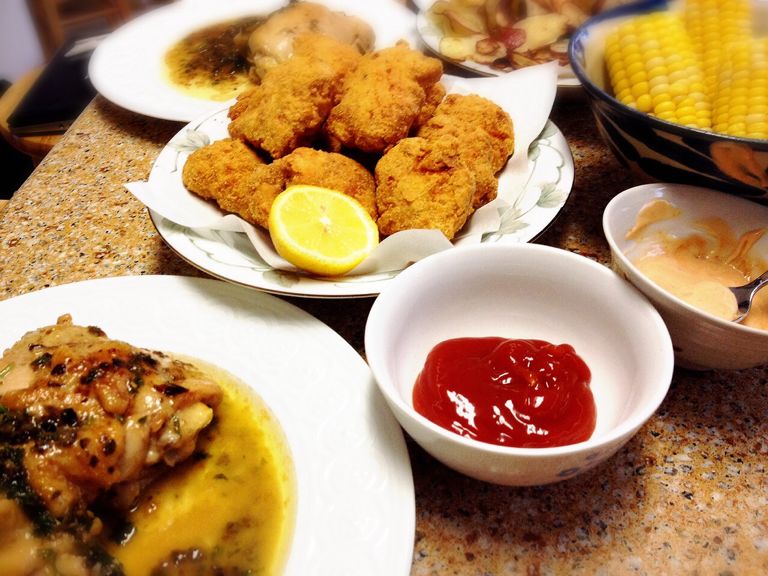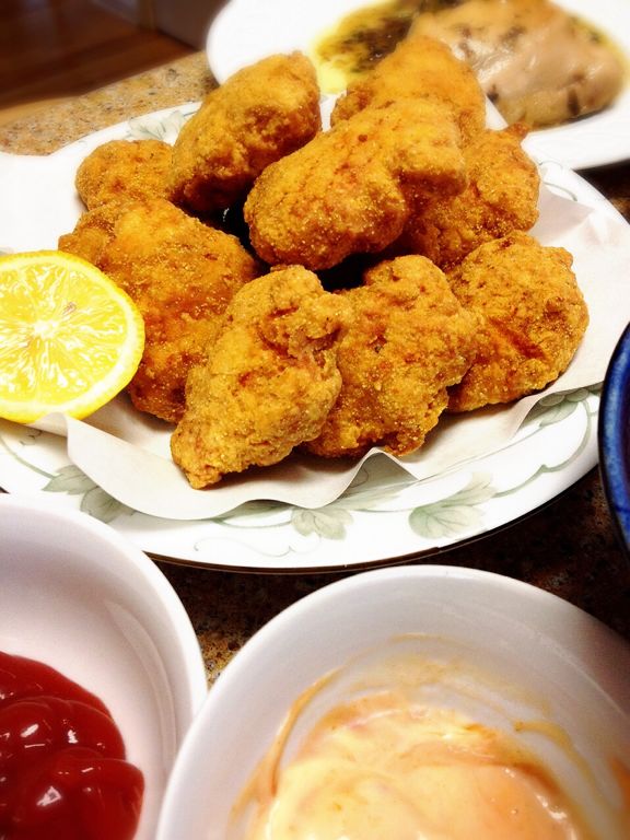 去年の感謝祭で使ったコーンフラワー残ってたの、よかった使えて。とりささみを包丁で叩いてミンチ状にするのが面倒。その後形成して冷凍するのも面倒。粉と卵をつけてもう1回粉をつけるのも面倒。そして最後に揚げるのも面倒。でもね、おいしかったのよ!だから許す。