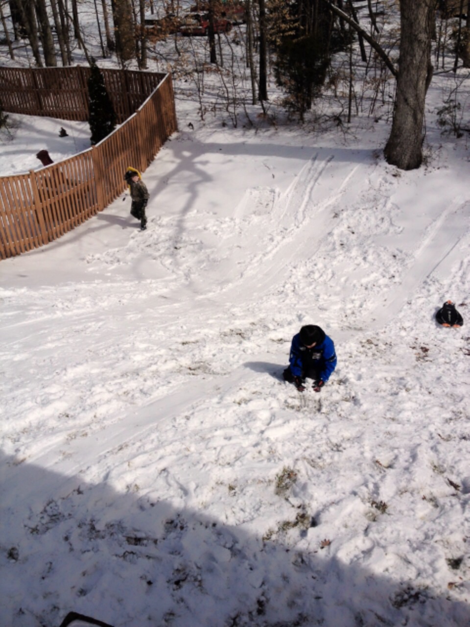 隣の兄弟とソリで遊ぶ小陸。夏の間は「こんな坂になってるバックヤードって使えない」って思ってたけど、この冬は大活躍。ソリで遊ぶのにちょうどいい。借家だから芝が傷むとかあまり考えなくていいし。