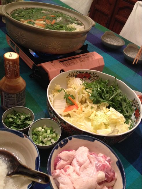 しなしなの白菜と春菊がかろうじてあったのでこんな寂しい野菜と鴨一羽をさばいて鍋にしてみました。うどんもなかったのでチャプチェ用の麺を投入。ま、うどんよりはローカロリー?