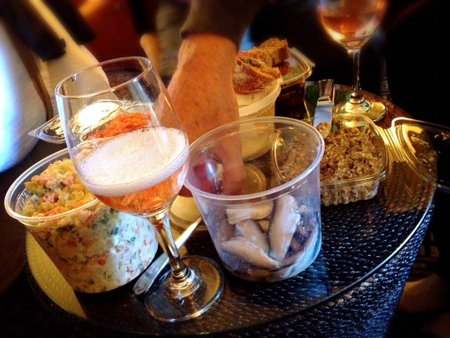 ロシアングローサリーで買ったお惣菜、パン、スパークリング。意外に(?)においしかった。最近ロシア人が増えてるらしいです、なぜか。イブの日はお魚だよねってことで、ニシンの酢漬け。