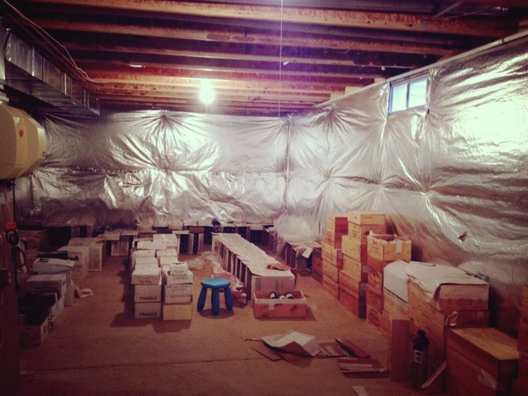 うちの地下は結構広いのですが一角はこんな感じでワインで埋め尽くされてる。イケアの青いベビーチェア、ひとつ見当たらないなって思ったらこんなところにあったよ。老陸がこれに座ってワインの記録をコンピューターに入れたりしてるの。