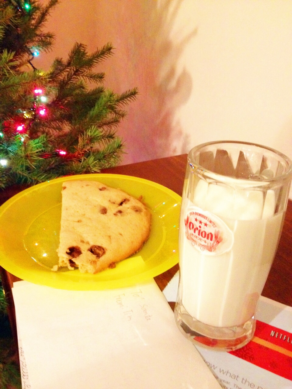小陸手作りのクッキーとミルク(オリオンビヤーグラス、グッドチョイス!)、お手紙をサンタへ。