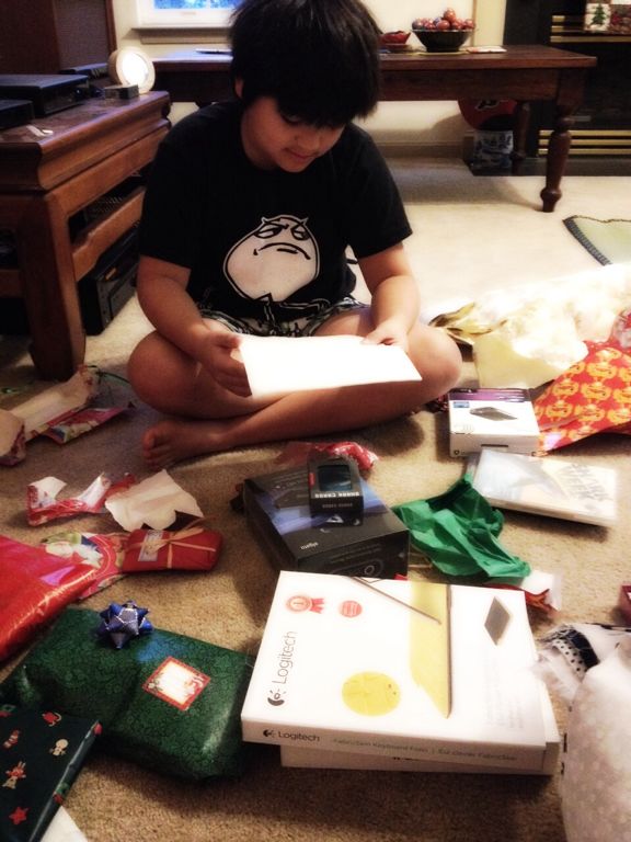 見てよ、このビリビリぶり・・・。マックブックがほしかったらしいのですがサンタからの返事には「まだ君は小さいので今年はアイバッドエアーをあげるよ。ただしお母さんとシェアだからね」って。老陸、左手で書いたなこの返事。汚くて読めないよ(笑)。そのほか老人にはわけのわからない電子部品など(お高い)。コンピューターにつなげて録音したりとか?なにするんだろ。