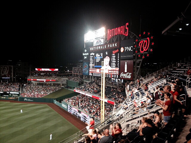 引越しの疲れを癒す間もなく毎日イベント・・・夜6時からのメジャーリーグ観戦に行ってきた。ワシントンDCの地元チームナショナルズ対コロラドロッキーズ。チッ、どっちも日本選手いないわ。前回は相手がレンジャースでしかもダルが先発予告だったから結構周囲の日本人も見に行ったという話でしたが。