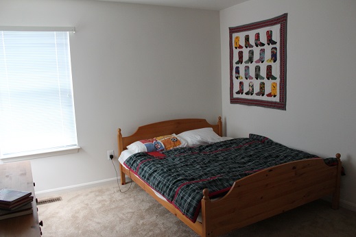 小陸の部屋。IKEAのベッドは覚えてたけどチェストもあったなんて嬉しい驚き。新婚当初、アメリカ人に習って初めて作ったカーボーイブーツのキルトを飾ってみました。少しは部屋らしくなったかな。