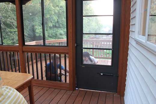 バトル中。お隣のお兄ちゃん、Armyのダディのお下がりで本物のヘルメットとかバックパックとか持ってて小陸、超うらやましそ~。でもうちもね、奇跡的に沖縄で昔友人の御主人(Marine)に買ってもらったバックパックがパリの荷物から出てきたのだ!