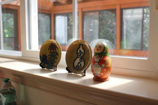東京を去る直前に友人二人からそれぞれもらった餞別の九谷焼小皿とロシアのマトリョーシカ。キッチンの窓辺に飾りました(背景はポーチです、これについてはまた)。