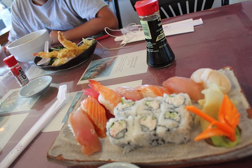 ランチスペシャル。10ドルくらいだったか。サーモンとほたてがおいしかったです~。あ~助かった~って感じです。小陸は天ぷらうどんをオーダーしたら、天ぷらが別皿で。アメリカ風ですか。