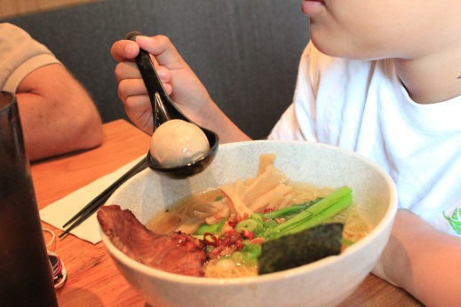 インテリアも日本人が作ったちゃんとした和風(意味わかります?)で落ち着くわ。メニューは英語・日本語・中国語で。トッピングの卵は1ドル。替え玉は2ドルくらいだったかな。小陸はいつものとおりに塩ラーメン。でも見た瞬間に「かまぼこが乗ってない~!」と御不満そうで(笑)。あんたの好きな八番ラーメン(北陸の人しか知らないお店です)とどっちがおいしい?って聞いたら間髪いれずに「八番だよ~」と言ってましたが。スープがちょっと濃いかも。アメリカ人向けですね。