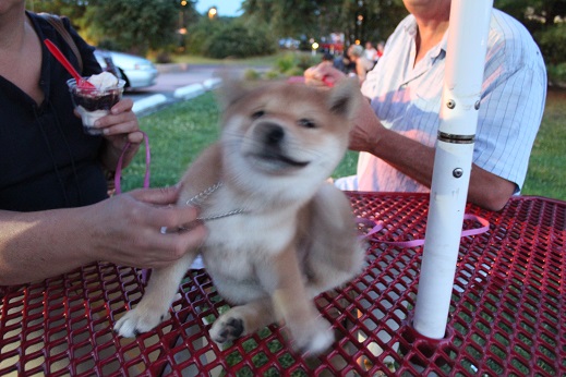 気持ちのいい夜だったので外のテーブルで食べていると小陸が突然「お母さん!柴犬だよ!」って日本語で叫んだの。隣のテーブルに超かわいい2ヶ月くらいの柴犬パピーを連れた夫婦が。先に食べ終わった老陸は意識的に柴犬を無視して車を取りに。その間、義姉が「あの犬が欲しいんでしょ。話しかけましょうよ」ってズンズン行くわけ。この人、こういうところめっちゃフレンドリー。