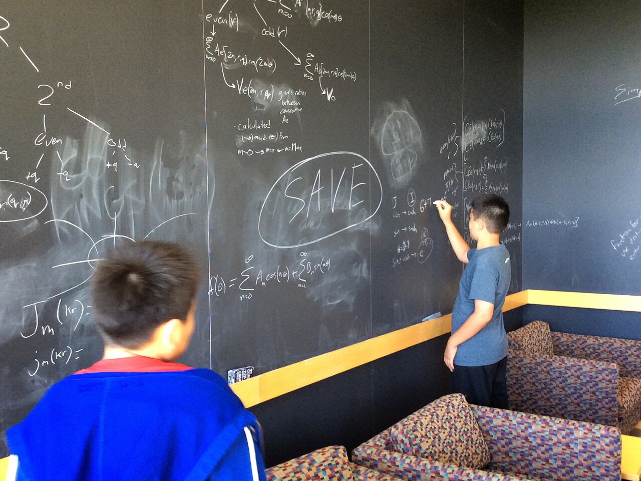 サイエンスセンターのロビーには生徒が書き残した数式らしきものが。そこで落書きして喜ぶやつら。